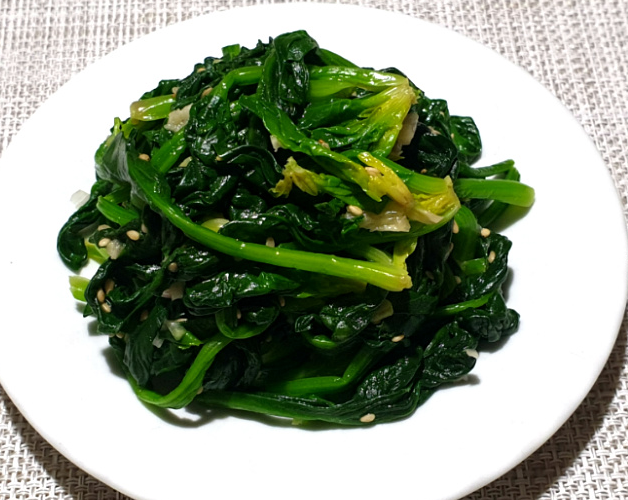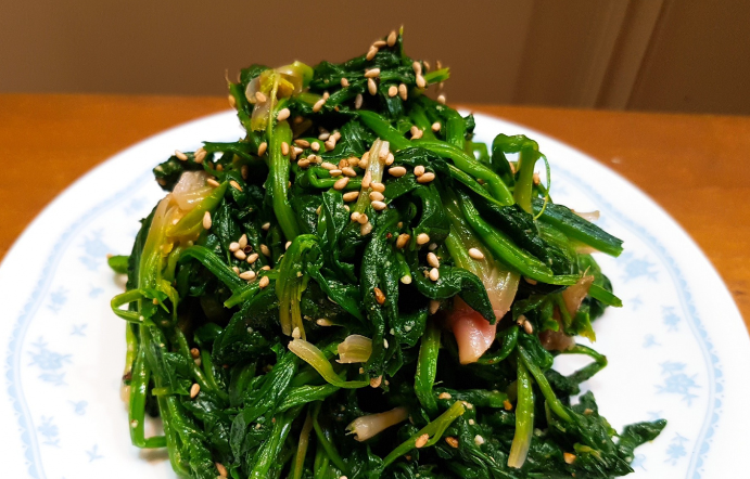 - 시금치무침을 그릇에 담고 통깨와 다진 파를 뿌려 장식합니다.