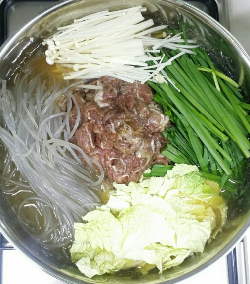 냄비에 물을 끓여 불고기와 양념한 고기를 넣고 끓입니다. 고기가 익으면 야채를 넣고 더 끓입니다.