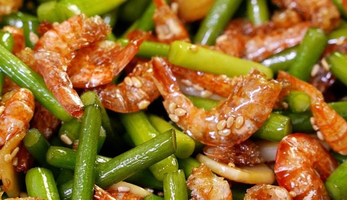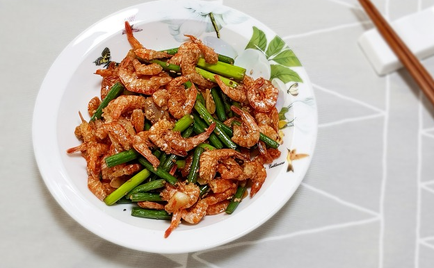 건새우를 사용하기 전에 먼저 물에 담가 불필요한 소금을 제거하세요. 그리고 물기를 털어낸 후 건새우를 노릇하게 볶기 위해 미리 튀김 유에 볶아주세요. 건새우가 황금빛으로 익을 때까지 약 2-3분 정도 볶아주면 됩니다.