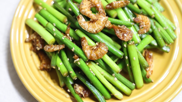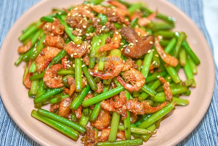 건새우가 황금빛으로 익으면 마늘쫑을 넣고 함께 볶아줍니다. 마늘쫑이 식물성 오일에 잘 익을 때까지 약 2분 정도 볶아주세요.