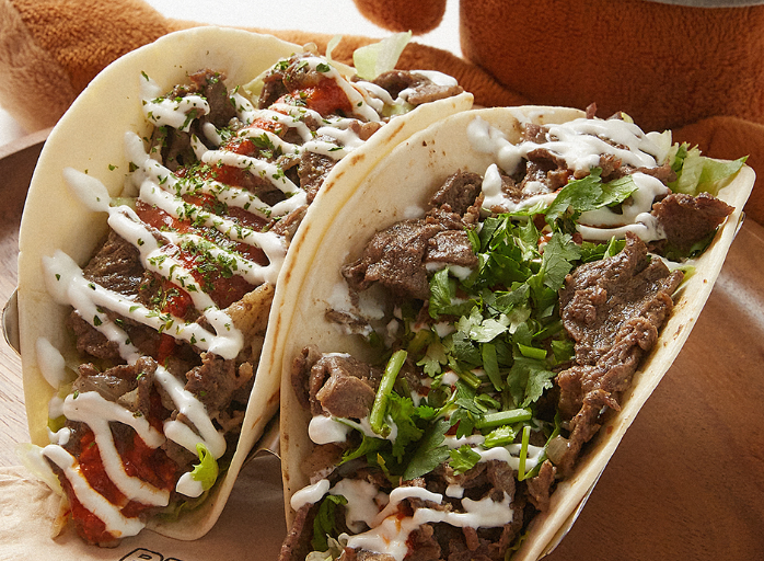 타코를 반으로 접어 먹기 편하게 만듭니다.