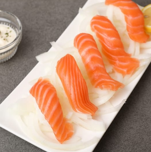 1. 연어를 얇게 슬라이스하거나, 연어 캔을 사용할 수 있습니다. 2. 연어를 적당한 크기로 잘라둡니다.