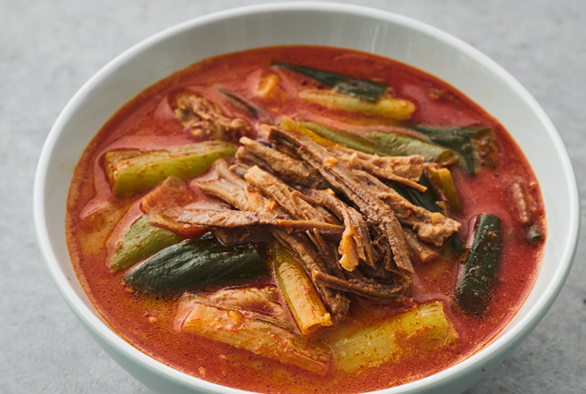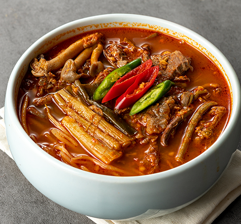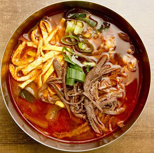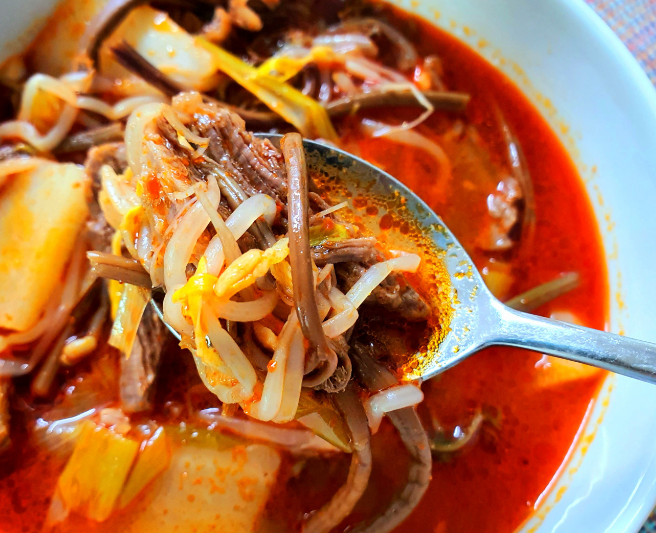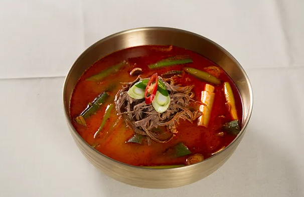 육개장은 고기와 야채가 풍부하게 들어간 매콤한 국물 요리로, 한국의 대표적인 전통 음식 중 하나입니다.
