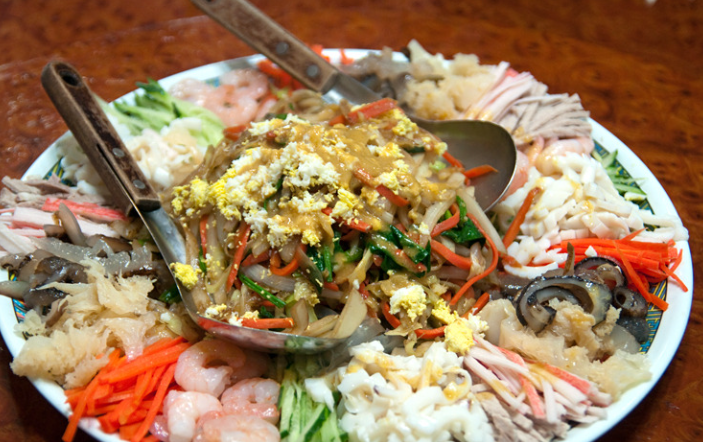 - 양장피 소스의 각종 야채와 과일을 잘게 다져 넣어야 고루 먹을 수 있습니다.