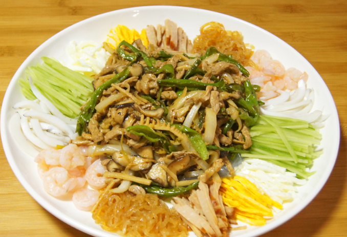 양장피 만드는법를 그릇에 담고 소스를 곁들여 즐기세요. 밥 위에 양장피를 얹어 먹어도 맛있습니다.