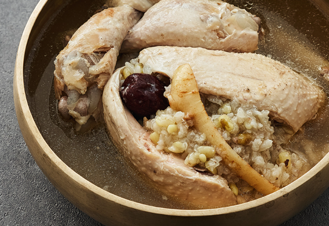 삼계탕은 한국의 전통 음식 중 하나로, 특히 여름철에 소비되는 건강한 음식 중 하나입니다. 이 음식은 한방 의학에서 열을 내려주는 효능이 있다고 알려져 있습니다.