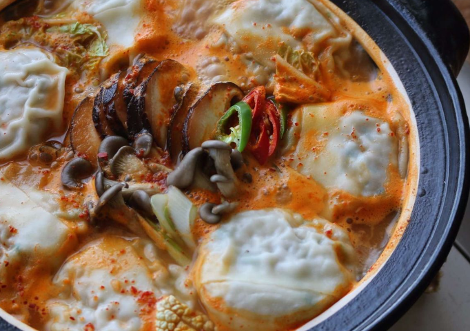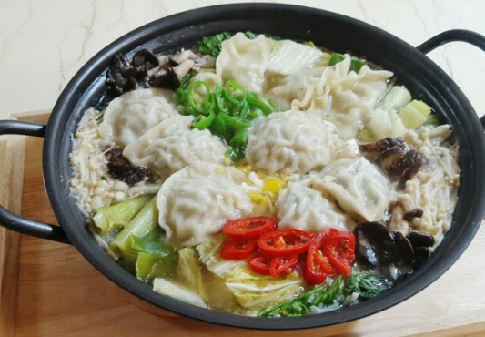 - 버섯과 배추, 고추 등을 넣고 황금 비율의 국물을 찾아내어 만두 전골을 조리합니다.