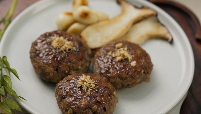 - 떡갈비 형태로 만들어 팬에 참기름을 두르고 구워줍니다.