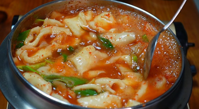 - 삶은 수제비에 양념을 넣고 잘 섞어 끓입니다.