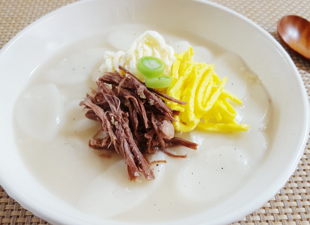 - 소고기떡국을 그릇에 담고 깨와 참기름을 뿌려 마무리합니다.