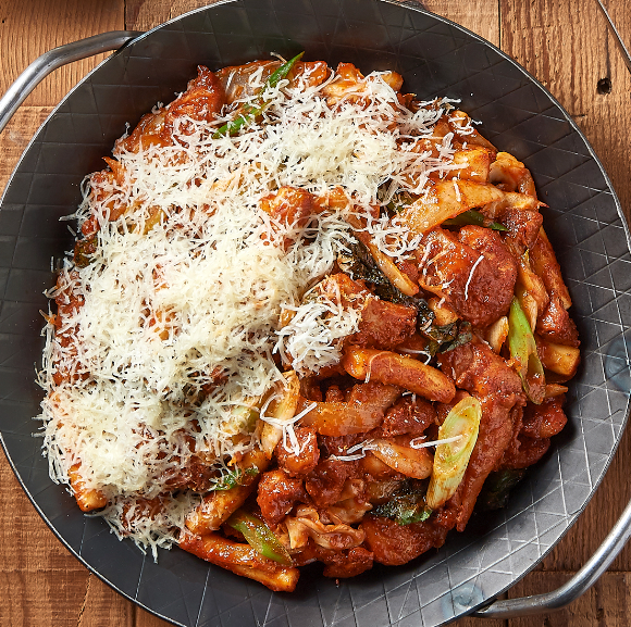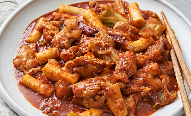 - 팬에 참기름을 두르고 중불에서 닭고기와 야채를 볶아낸 후 떡볶이 떡을 넣고 함께 볶아줍니다.